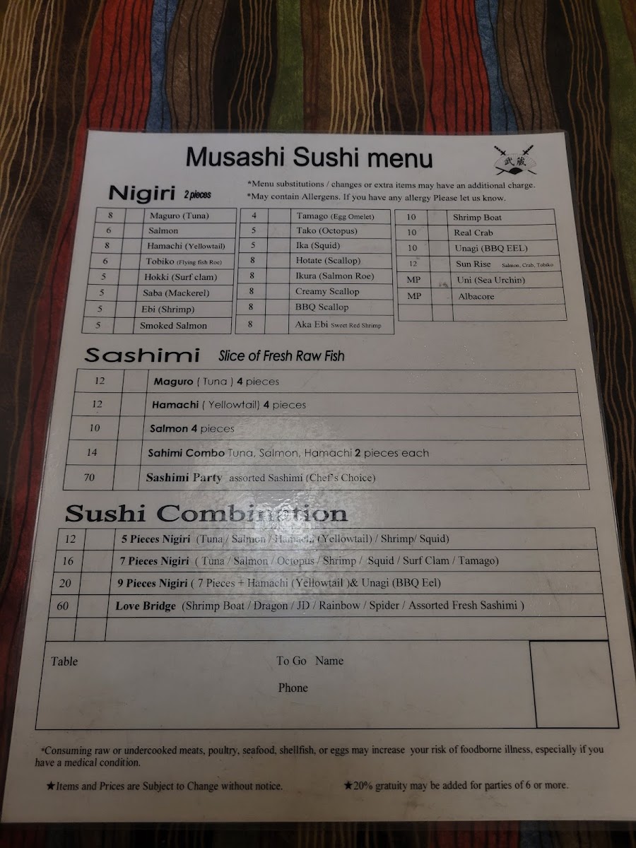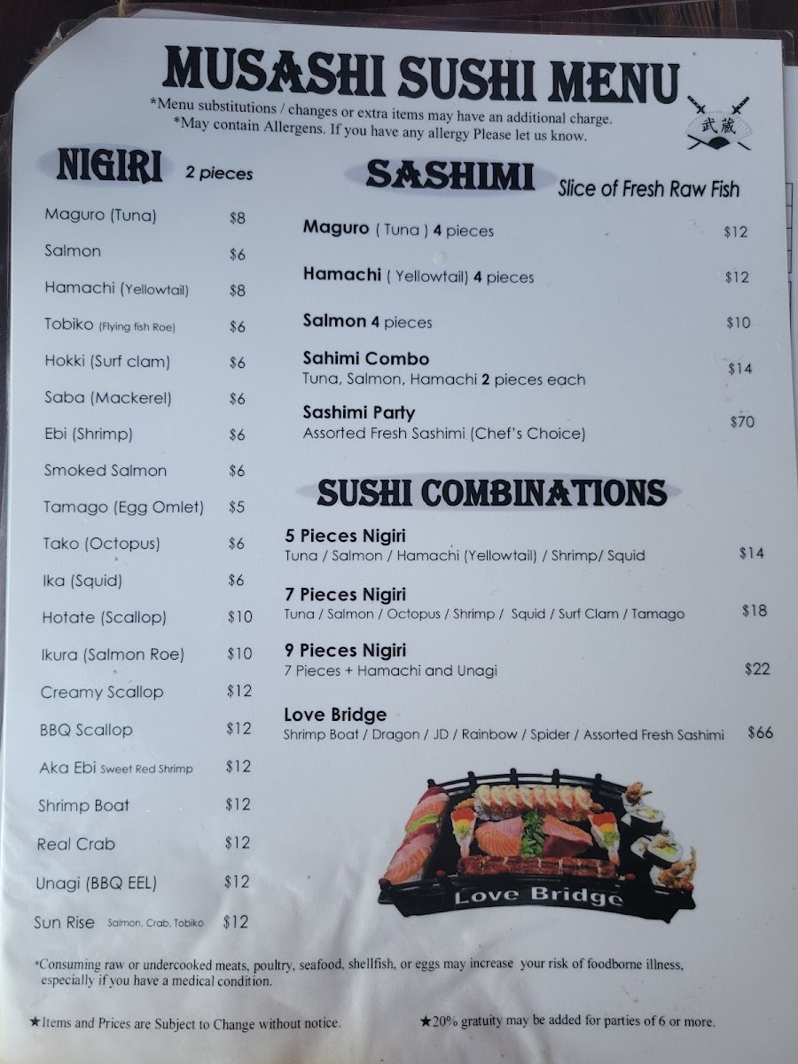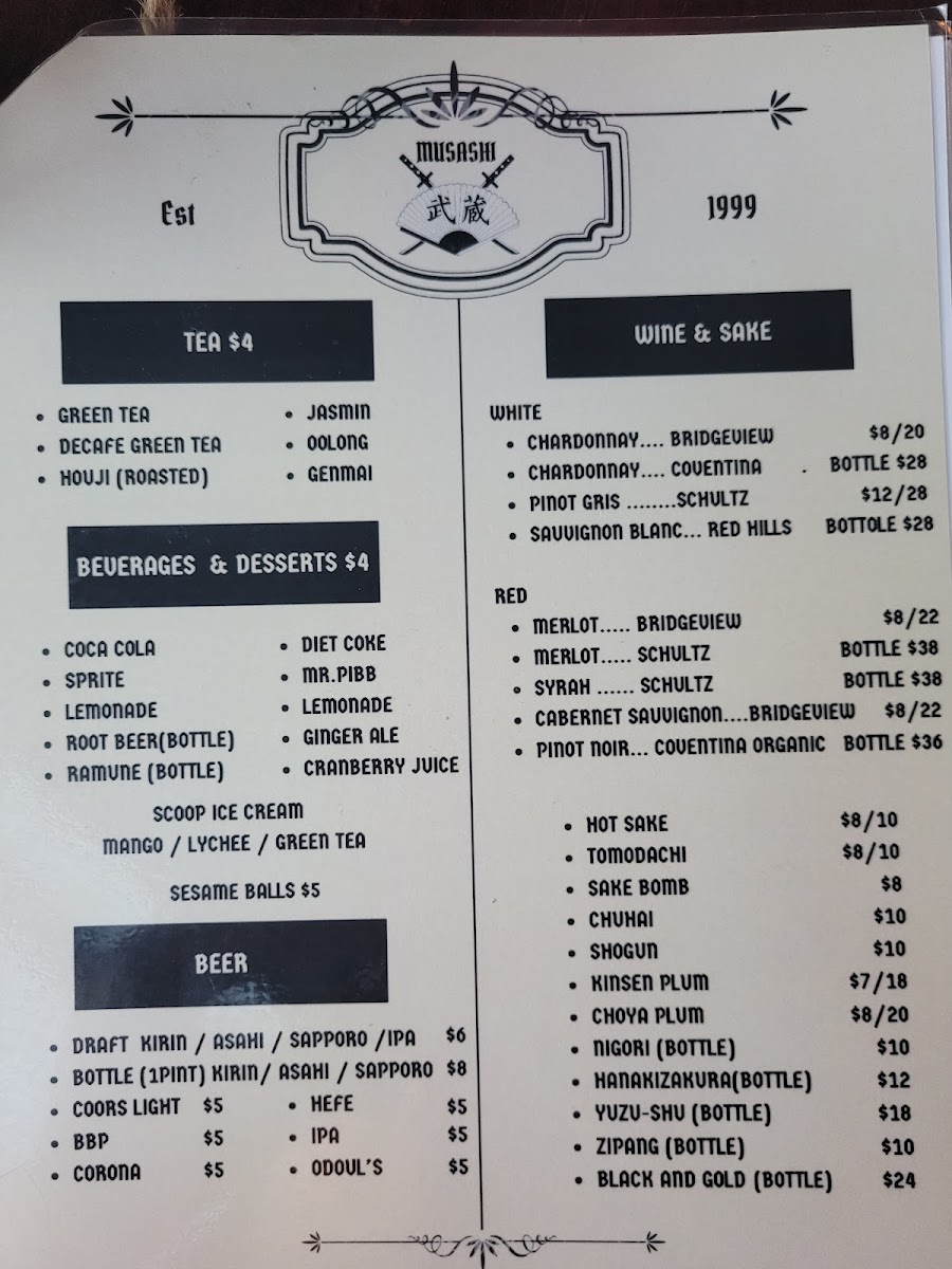Musashi Sushi Bar and Japanese Cuisine Menu